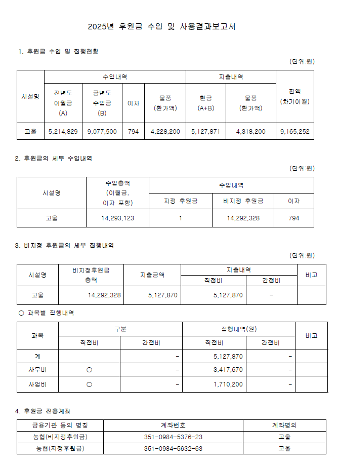 2025년 고울 후원금품 수입 및 지출내역 공고